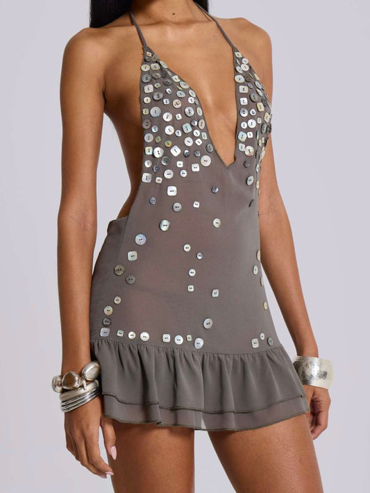 Silver Button Detail Mesh Halter Mini Dress | Reigned