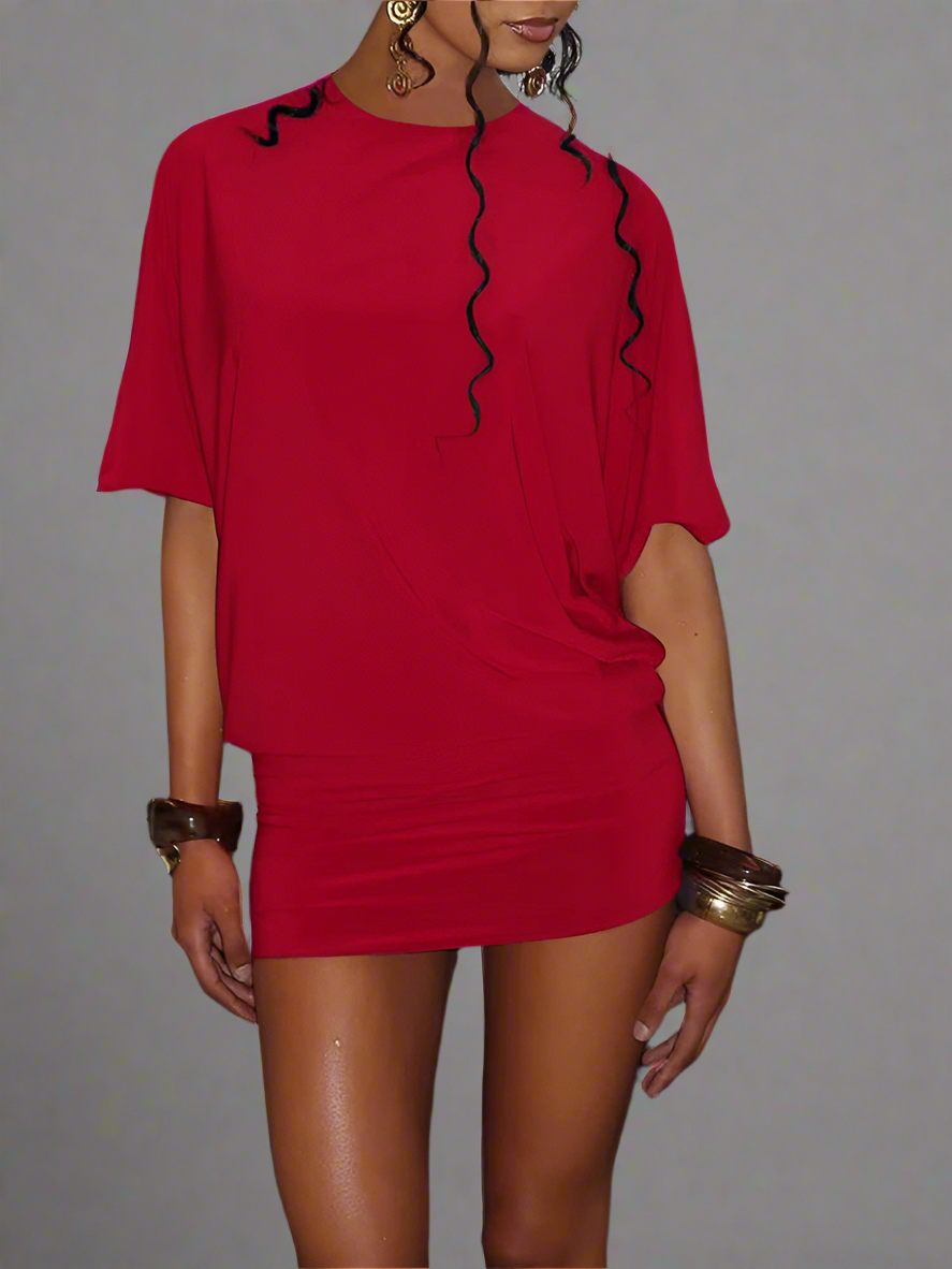 The Backless Batwing Mini Dress by Reigned serves up Y2K drama with a sleek, sultry twist. Designed in a high-stretch polyester-spandex blend, this slim-fit sheath dress features batwing-style half sleeves and a daring open-back cut. Its mini length and body-hugging silhouette make it perfect for nights out or statement daywear.