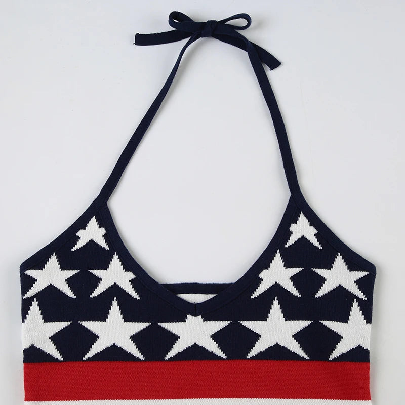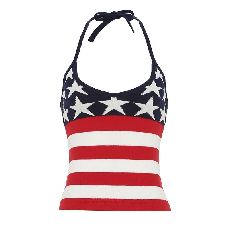 The Stars & Stripes Backless Halter Top by Reigned channels bold Y2K energy with a sleek, patriotic twist. Crafted from a soft polyester-spandex knit, it features a short, body-hugging fit with medium stretch. The backless halter design makes it a standout choice for warm-weather looks.