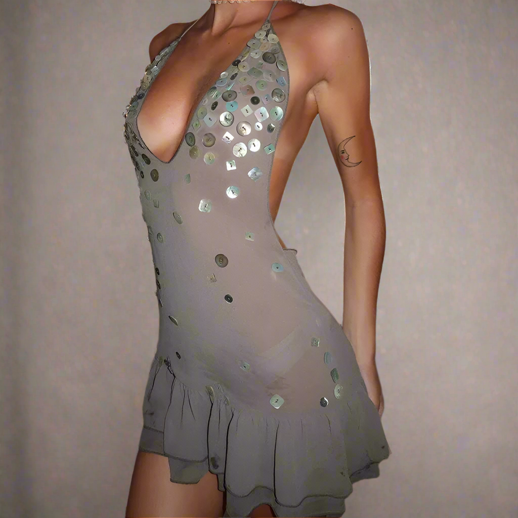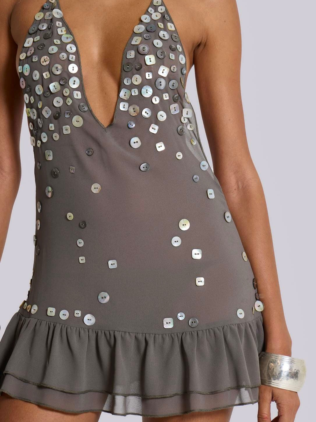Silver Button Detail Mesh Halter Mini Dress | Reigned